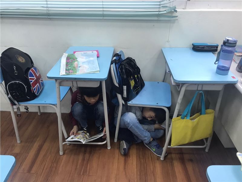 今天孩子們完成了本學期的防火與地震逃生演習活動,孩子在模擬地震來臨時的狀況,聰明的躲在桌子下或拿身邊物品保護自己的頸部並學到三要領,〝蹲下、找掩護、抵桌腳〞及三不原則〝不語、不跑、不推〞,待地震結束後也聽從老師的指令疏散到安全的一樓戶外區。如果孩子回家後,提到對火災發生的疑問或擔憂,希望您可以和孩子一起討論「在家中如何預防止火災發生」?「如果發生地震,該怎麼辦」?等話題,這是給孩子難得的機會教育喔!